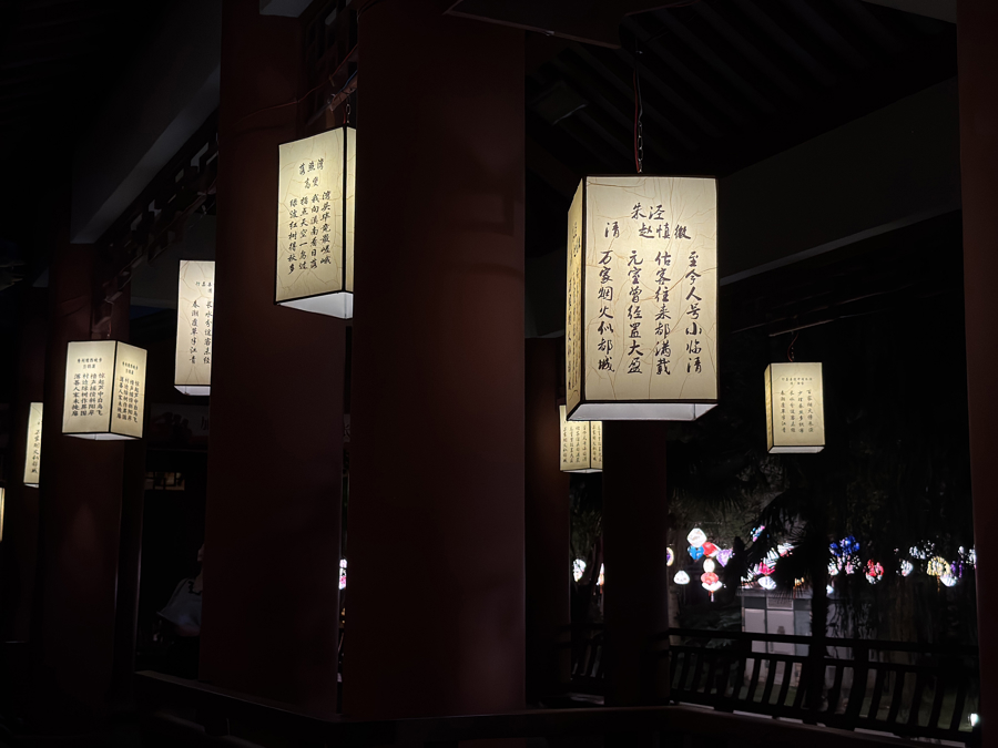 “万家烟火似都城,元室曾经置大盈。估客往来都满载,至今人号小临清。”“朱溪碧水静亭亭,晚唱渔歌隔远汀。一阵荻花疏雨落,遥山齐露佛头青。”在船子缘公园的盏盏花灯下,清代诗人赵慎徽和高以寀所写的《朱泾》和《朱溪》两首描绘朱泾地区人文风貌的诗句被朱泾后人吟诵而出。